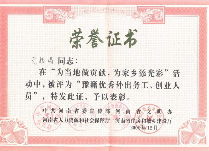董事長司振濤被評為“豫籍優(yōu)秀外出務(wù)工、創(chuàng)業(yè)人員”