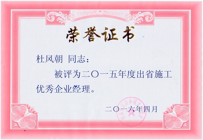 總經(jīng)理杜風(fēng)朝榮獲2015年度出省施工優(yōu)秀企業(yè)經(jīng)理稱號(hào)