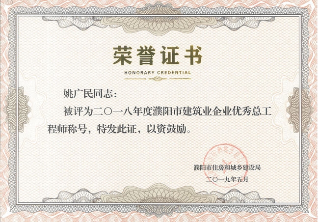 總工姚廣民榮獲2018年度濮陽(yáng)市建筑業(yè)企業(yè)優(yōu)秀總工程師稱號(hào)