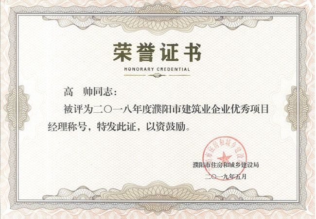 項(xiàng)目經(jīng)理高帥榮獲2018年度濮陽(yáng)市建筑業(yè)企業(yè)優(yōu)秀項(xiàng)目經(jīng)理