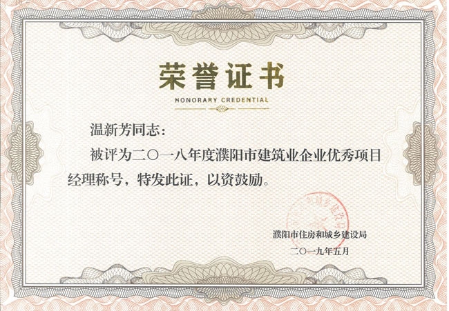 項(xiàng)目經(jīng)理溫新芳榮獲2018年度濮陽(yáng)市建筑業(yè)企業(yè)優(yōu)秀項(xiàng)目經(jīng)理
