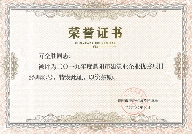 副總經(jīng)理亓全勝榮獲2019年度濮陽市建筑業(yè)企業(yè)優(yōu)秀項目經(jīng)理稱號